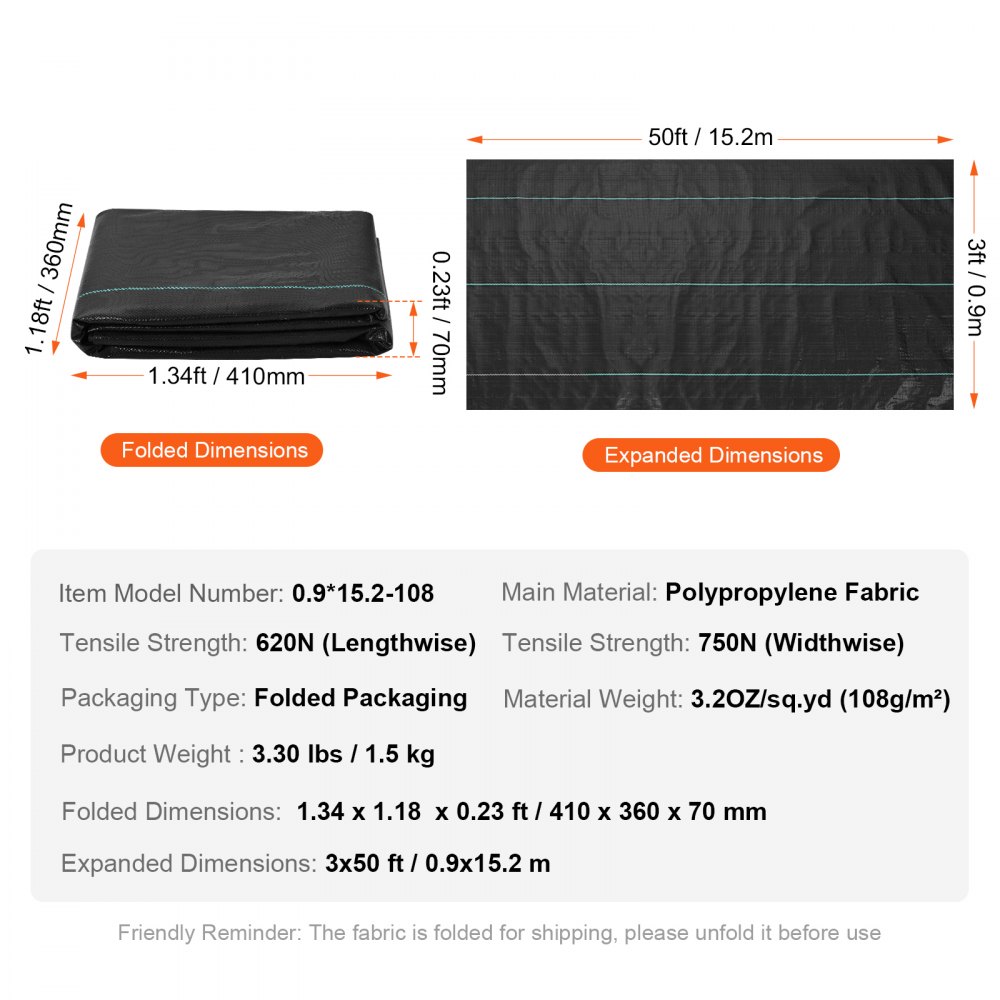 Odolná zábrana proti plevelu: Tkaná zábrana proti plevelu VEVOR o rozměrech 3 x 50 stop, vyrobená z polypropylenu s vysokou hustotou 3,2 unce, odolného proti roztržení a korozi, je preferovanou volbou pro zemědělství a průmysl. Zajišťuje vynikající prevenci plevele a podporuje zdraví půdy, čímž udržuje vaši zahradu bez plevele po delší dobu.