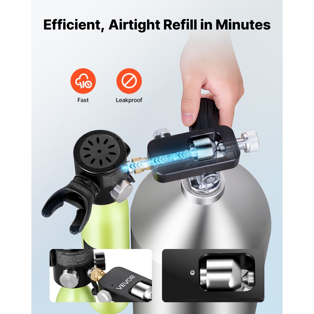 Ideální pro nouzové situace a údržbu: Náš přenosný adaptér pro doplňování vzduchu do potápěčské lahve je ideální pro rychlé doplnění záložní nouzové lahve. Zajišťuje také efektivní doplňování vzduchu během rekreačních ponorů nebo tréninků.