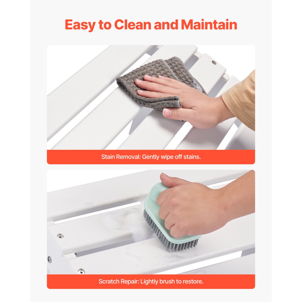 Snadná montáž: Pouze 4 kroky – otevřete šrouby řetězu, vložte šrouby, utáhněte a zajistěte podnožku Adirondack. Rychlá montáž, která vám ušetří čas a námahu. Očistěte mýdlem a vodou a k vyleštění škrábanců použijte měkký kartáč nebo brusný papír.