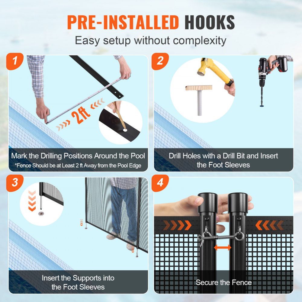 Uživatelsky přívětivé detaily: Každý odnímatelný bazénový plot je dodáván s extra sadou příslušenství (ochrana proti nohám + krytka), spolu s pomocnou montážní šablonou pro vrtání a podrobným návodem k instalaci. Pro zajištění přesné instalace doporučujeme použít vrták o průměru 0,63" (není součástí dodávky).