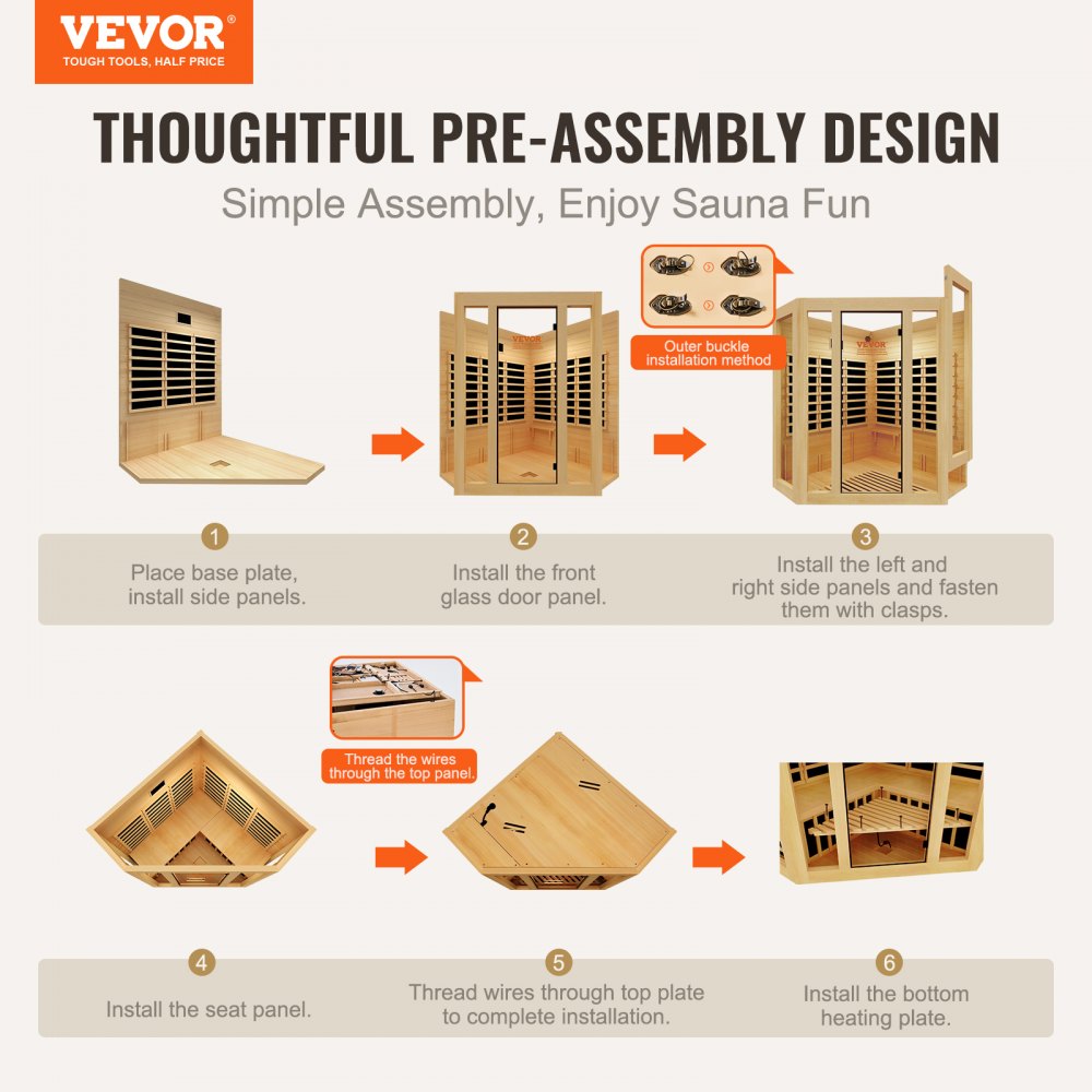 Předmontovaná konstrukce: Sauna má předmontovanou konstrukci, která po obdržení vyžaduje pouze jednoduchou montáž. Součástí dodávky jsou jasné instalační pokyny a schémata zapojení, které eliminují potíže se složitým šroubováním.