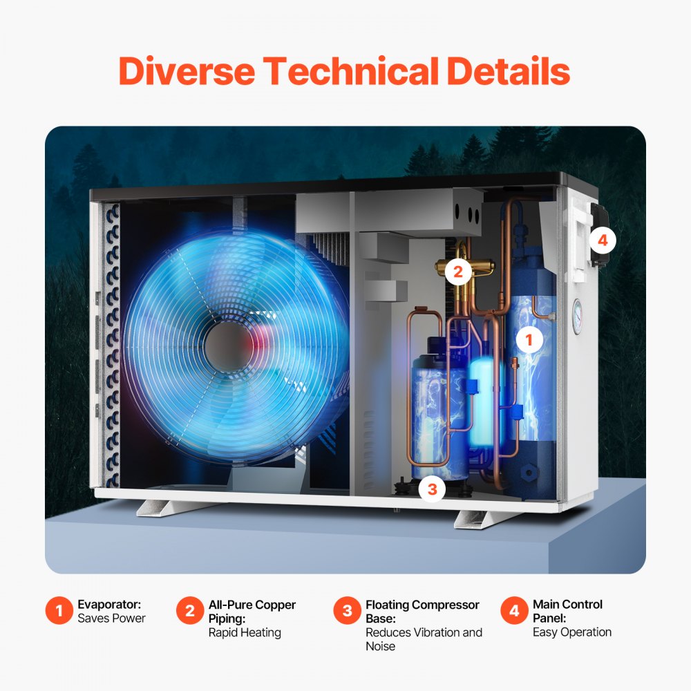 Elektrické bazénové tepelné čerpadlo VEVOR, topný výkon 2,51–11,38 kW, energeticky úsporné ohřívače bazénů s proměnnou frekvencí pro nadzemní bazény o objemu 25–50 m³, ohřev a chlazení ohřívače bazénové vody AC220–240 V 50 Hz