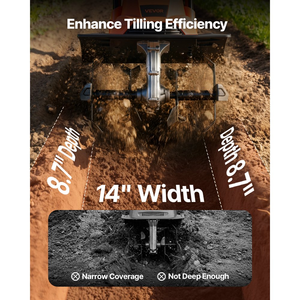 Vysoce efektivní orba: Ultraširoká pracovní šířka 35 cm zvyšuje účinnost o více než 30 %; Maximální hloubka 21 cm splňuje potřeby hlubokého setí; konstrukce se 4 noži x 4 hroty pomáhá zkrátit pracovní dobu. Náš zahradní kultivátor je ideální pro zemědělskou půdu i zahrady.