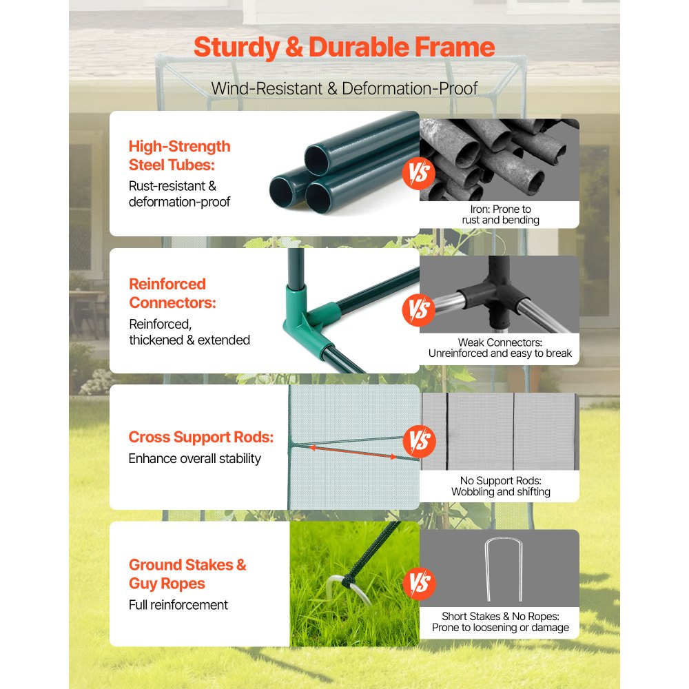 Stabilní a odolný proti větru: Náš stan na ochranu rostlin je vyroben z práškově lakovaných ocelových trubek a je odolný vůči rezivění a korozi. Zesílené plastové spoje a boční podpěrné tyče dodávají stabilitu, zatímco zemní kolíky ve tvaru U a kotevní lana zajišťují odolnost proti větru.