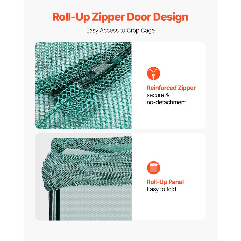Rolovací dvířka na zip: Dvířka klece na rostliny na zip mají zesílené okraje, které zůstávají bezpečné. Jednoduše rozepněte a složte závěs, abyste mohli sklízet nebo se starat o rostliny, a poté jej zavřete zipem, čímž vytvoříte zcela uzavřenou bariéru, která zabrání vniknutí zvířat.