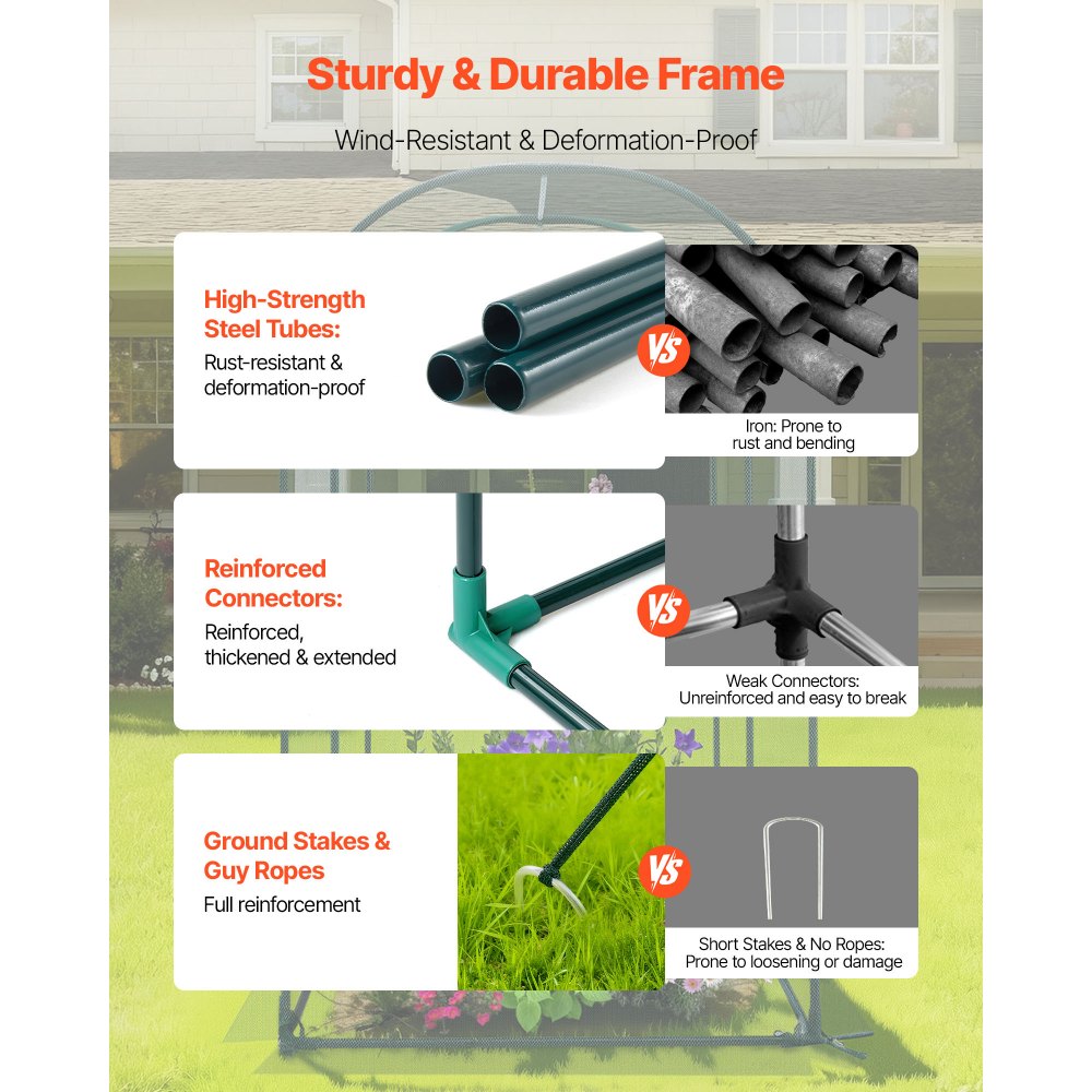 Stabilní a odolný proti větru: Náš stan na ochranu rostlin je vyroben z práškově lakovaných ocelových trubek, takže je odolný vůči rzi a korozi. Zesílené plastové spoje těsně přiléhají k hlavnímu rámu, zatímco zemní kolíky ve tvaru U a kotevní lana zajišťují odolnost proti větru.