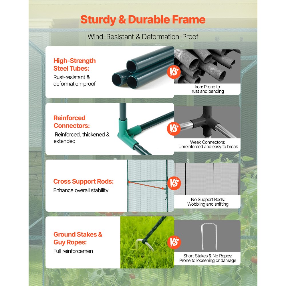 Stabilní a odolný proti větru: Náš stan na ochranu rostlin je vyroben z práškově lakovaných ocelových trubek a je odolný vůči rezivění a korozi. Zesílené plastové spoje a boční podpěrné tyče dodávají stabilitu, zatímco zemní kolíky ve tvaru U a kotevní lana zajišťují odolnost proti větru.