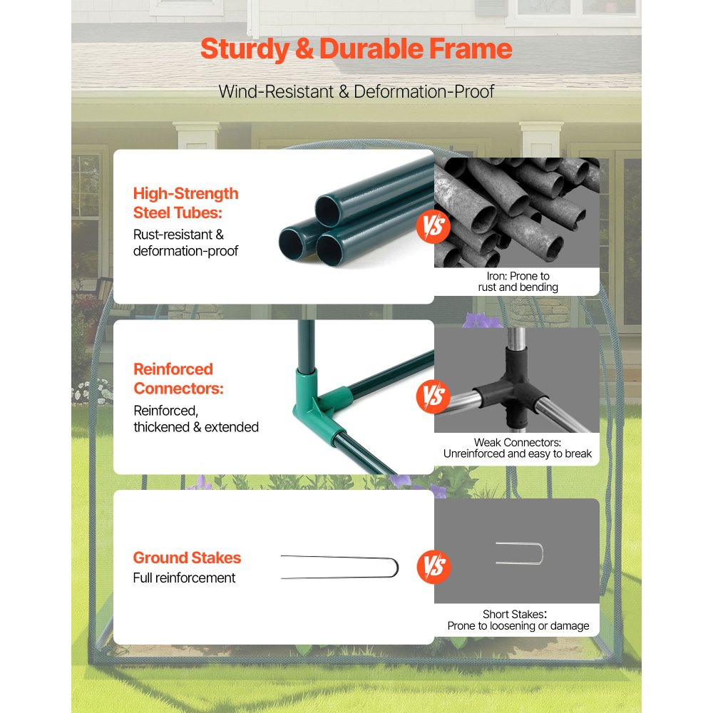 Stabilní a odolný proti větru: Náš stan na ochranu rostlin je vyroben z práškově lakovaných ocelových trubek, takže je odolný vůči rzi a korozi. Zesílené plastové spoje těsně přiléhají k hlavnímu rámu pro větší stabilitu, zatímco zemní kolíky ve tvaru U poskytují odolnost proti větru.