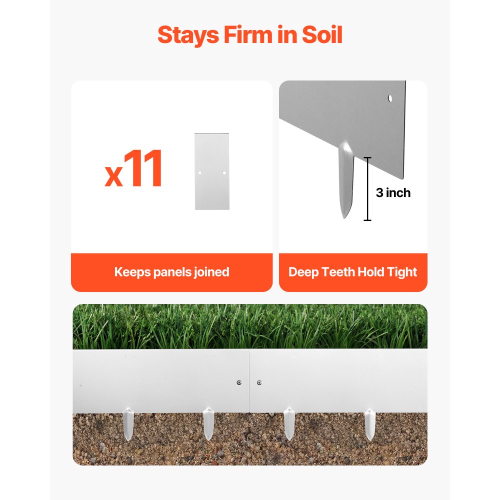Kompletní sada, připraveno k použití: Tato sada kovových zárubní obsahuje 10 dílů zárubní, 11 spojovacích desek, 1 otevřený klíč, 1 imbusový klíč a několik šroubů. Prodloužené hroty se hladce zasouvají do půdy, což usnadňuje a zpříjemňuje instalaci.
