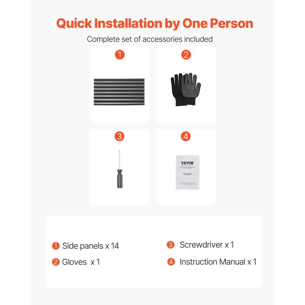 Co získáte: Náš vyvýšený záhon obsahuje 14 panelů, 1 pár rukavic, 1 šroubovák a 1 uživatelskou příručku.