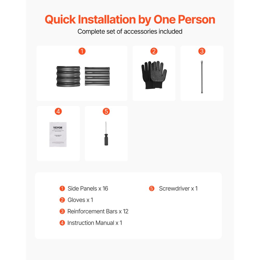 Co získáte: Náš vyvýšený záhon obsahuje 16 bočních panelů, 12 příčných tyčí, 1 pár rukavic, 1 šroubovák a 1 uživatelskou příručku.
