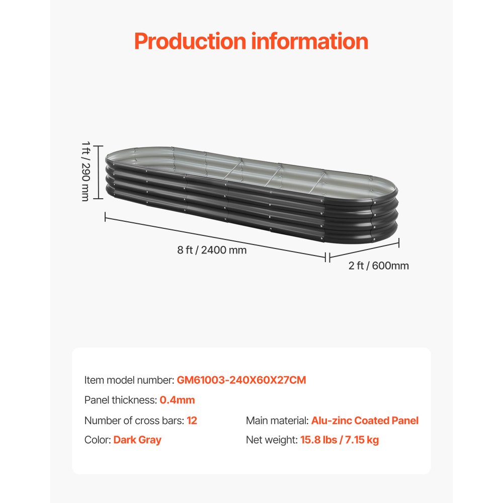 Kovový vyvýšený záhon, 2,4 x 0,6 x 0,3 m Oválný venkovní pozinkovaný zahradní truhlík, otevřené dno, Velký vyvýšený záhon pro pěstování zeleniny, květin, bylin, sukulentů, tmavě šedý