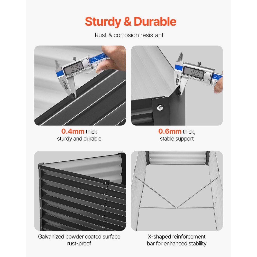 Robustní a odolný: Tento kovový vyvýšený zahradní záhon je vyroben z kovových bočních panelů o tloušťce 0,4 mm a kovových rohových spojovacích panelů o tloušťce 0,6 mm. Povrch je potažen pozinkovaným práškem pro odolnost proti rezivění a korozi, což zajišťuje dlouhodobé používání ve venkovním prostředí. 4 vnitřní výztužné tyče ve tvaru X poskytují extra stabilitu a zabraňují převrácení záhonu při silném větru. Připravte se na venkovní výpravy s jistotou!