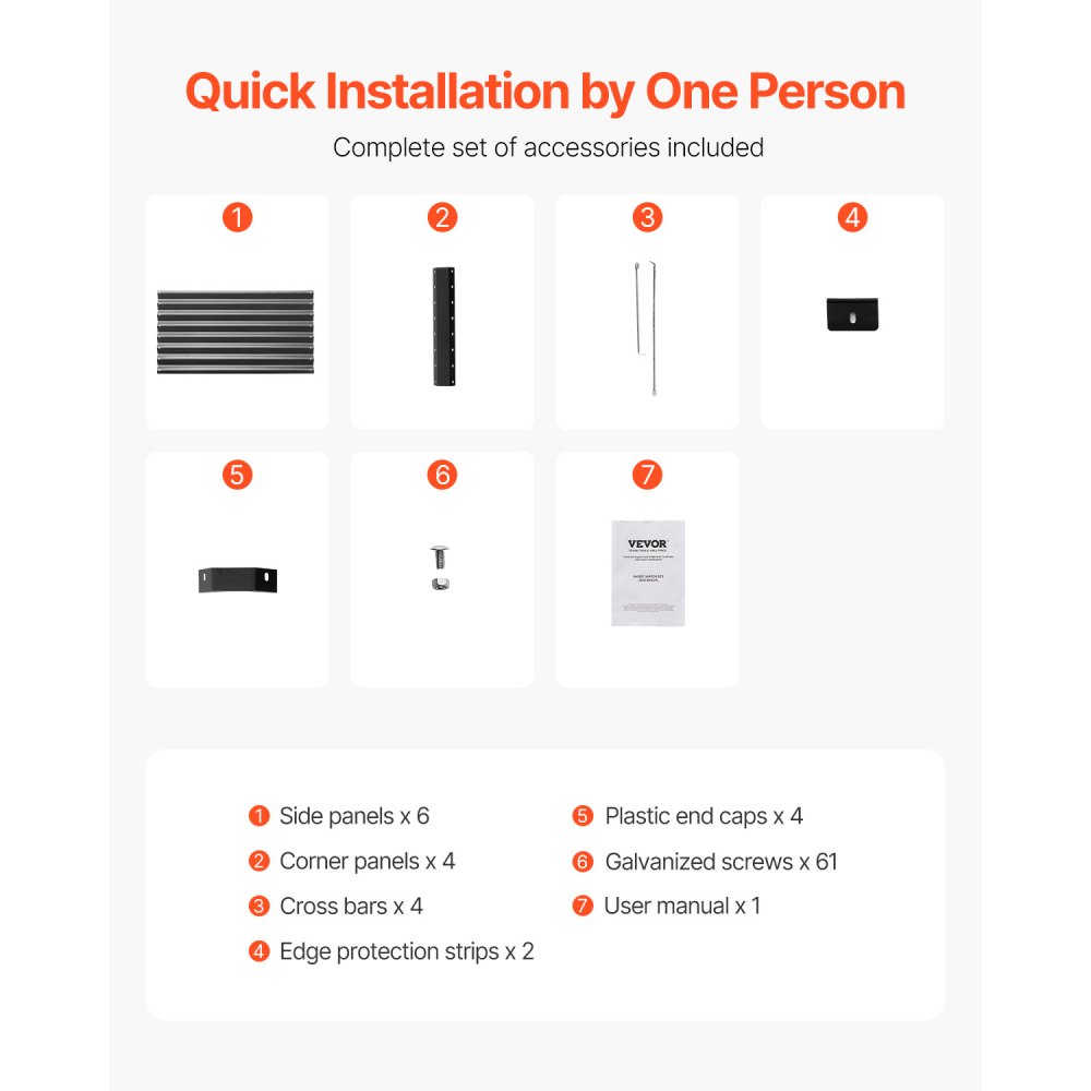 Co získáte: Náš vyvýšený záhon obsahuje 6 bočních panelů, 4 rohové panely, 4 příčné tyče, 2 ochranné lišty na okraje, 4 plastové koncovky, 81 pozinkovaných šroubů a uživatelskou příručku.