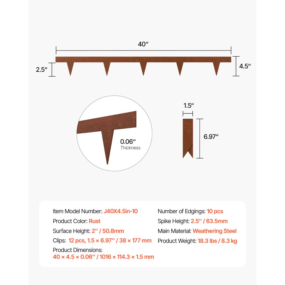Odolnost vůči povětrnostním vlivům a korozi: Tento okraj trávníku je vyroben z oceli odolné vůči povětrnostním vlivům a na okrajích je předem ošetřen rezivěním. Postupem času se rez prohlubuje a vytváří ochrannou vrstvu, která zvyšuje odolnost proti korozi a zabraňuje praskání. Jakmile se rez plně vytvoří, můžete nanést vrstvu polyuretanové barvy, která barvu zafixuje a prodlouží její životnost.