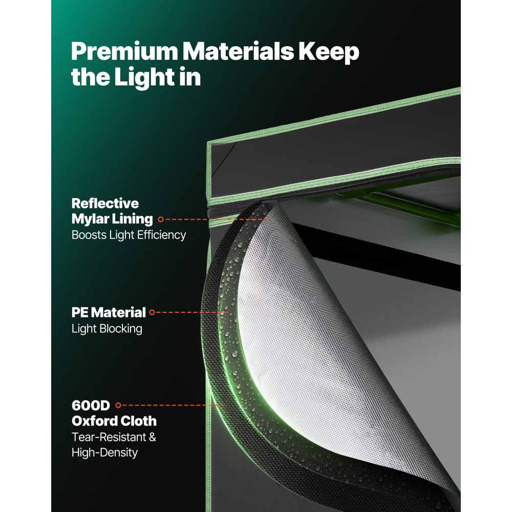 100% reflexní vnitřek: Vnitřek je vyroben z polyesterové fólie, která maximalizuje odraz světla a minimalizuje tepelné ztráty, čímž podporuje zdravější růst rostlin. Vnější vrstva je vyrobena z odolné oxfordské tkaniny 600D, která je odolná proti roztržení a blokuje světlo. Zipy s dvojitou černou podšívkou účinně utěsňují mezery.
