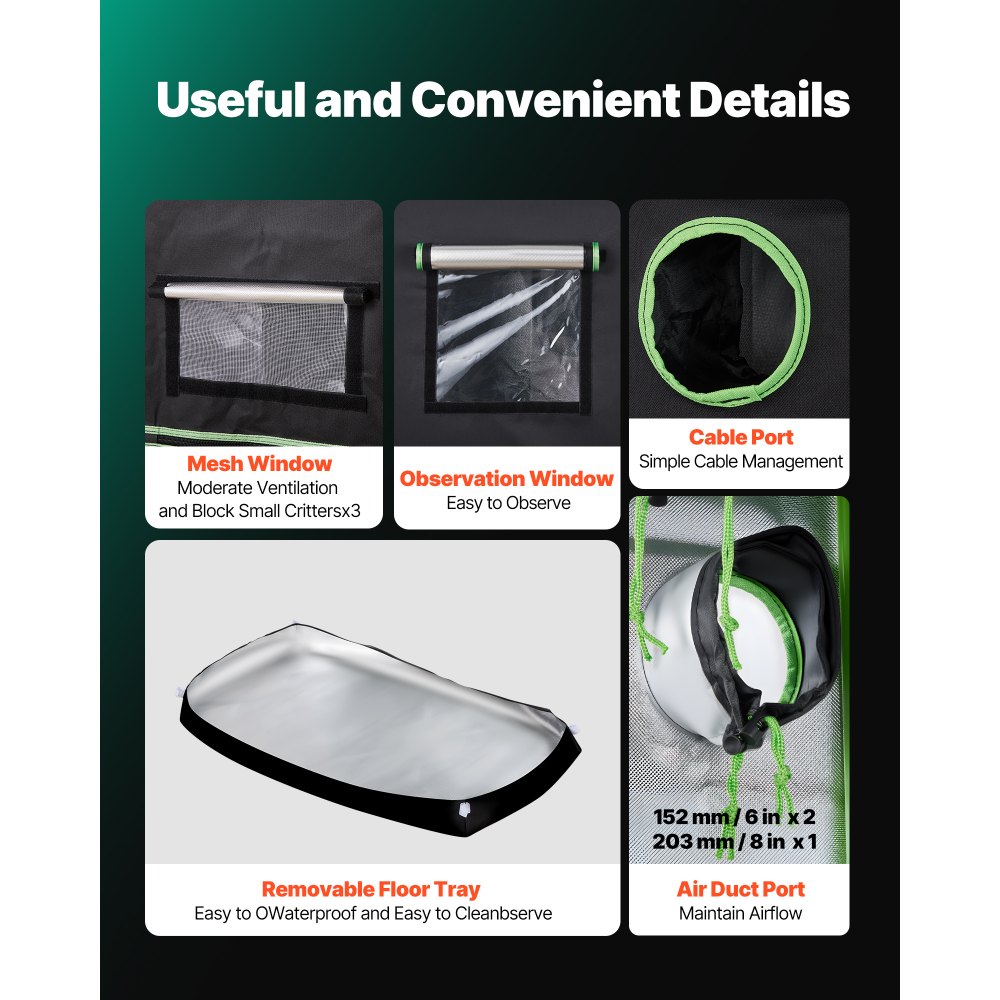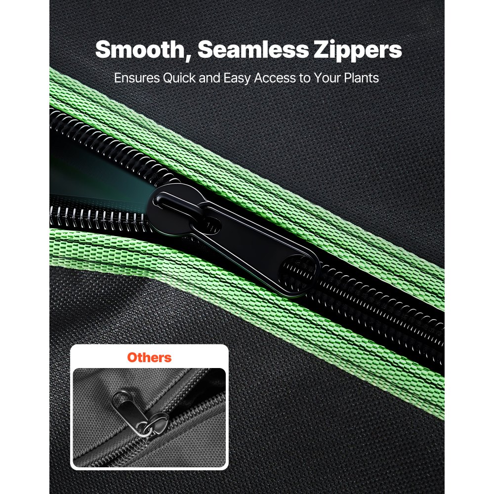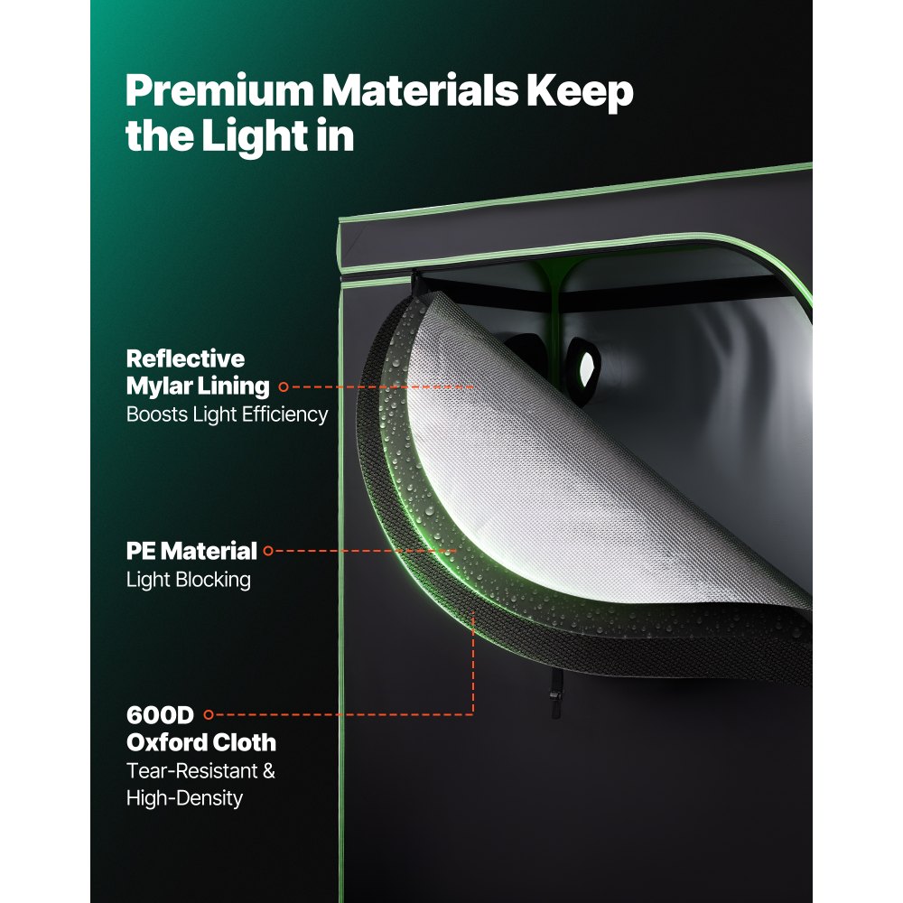100% reflexní vnitřek: Vnitřek je vyroben z polyesterové fólie, která maximalizuje odraz světla a minimalizuje tepelné ztráty, čímž podporuje zdravější růst rostlin. Vnější vrstva je vyrobena z odolné oxfordské tkaniny 600D, která je odolná proti roztržení a blokuje světlo. Zipy s dvojitou černou podšívkou účinně utěsňují mezery.