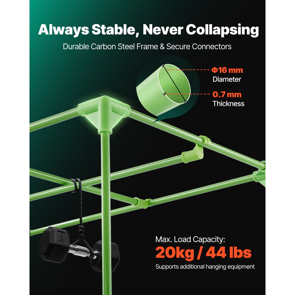 Stabilní a snadná montáž: Tento stan na rostliny je vybaven robustním kovovým rámem a nabízí silnou oporu, která zabraňuje deformaci nebo zhroucení. Jeho propojená konstrukce se stabilními rohovými spojkami umožňuje montáž bez použití nářadí. S maximální nosností 20 kg unese dle potřeby další vybavení.