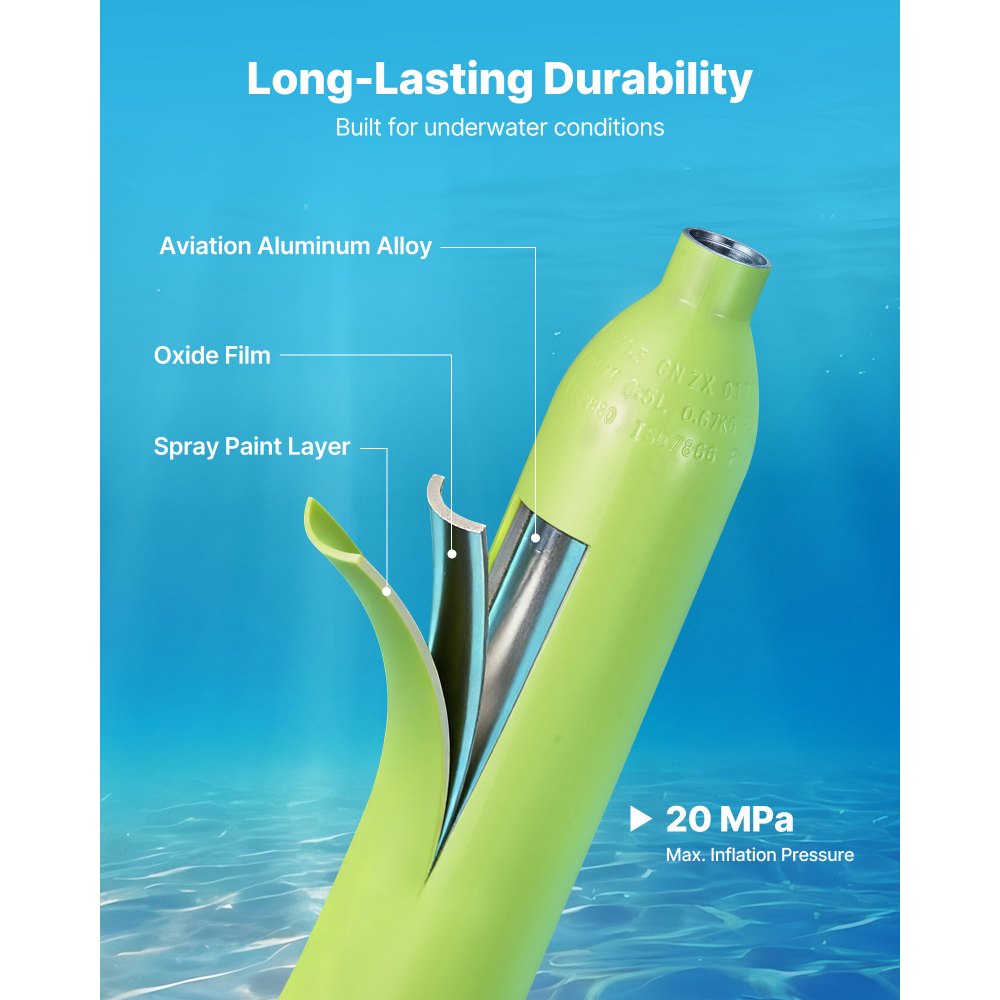 Zesílená lahev a ventil: Naše potápěčská lahev je navržena pro použití pod vodou a je vyrobena z leteckého hliníku s tlakem 20 MPa. Vylepšený dýchací ventil a externí disk odolný proti výbuchu zajišťují plynulé proudění vzduchu a spolehlivé použití v mělké vodě.
