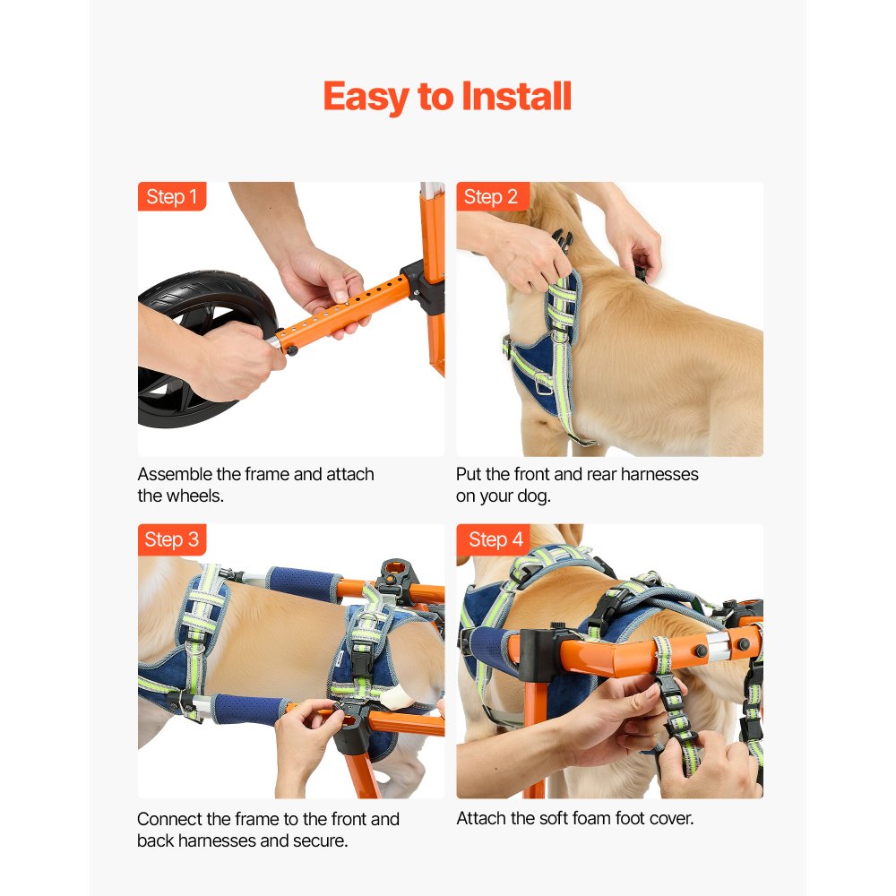 Důraz na pohodlí a bezpečnost: Náš invalidní vozík pro psy je vyroben z prodyšné a pratelné síťoviny, která udržuje psy v svěžím stavu, zatímco tlumící tichá kola s EVA dezénem omezují nerovnosti. Je navržen pro snadnou jízdu po štěrkových, trávě, nečistotách a asfaltových cestách.