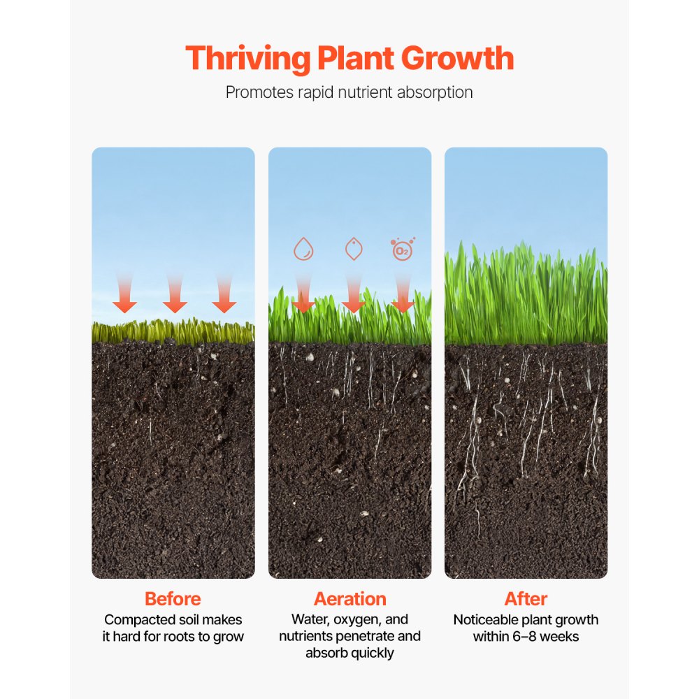 Podporuje růst rostlin: Tento ruční válcovací provzdušňovač trávníku zlepšuje strukturu půdy vytvářením otvorů, které rostlinám dodávají více vody a kyslíku, čímž zabraňuje žloutnutí nebo hnilobě způsobené nedostatkem kyslíku a vody. Během 6-8 týdnů uvidíte znatelný růst vašich rostlin.