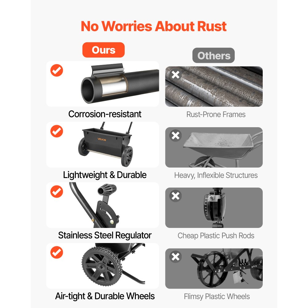 Odolná konstrukce: Rozmetadlo trávy je vyrobeno z práškově lakovaného ocelového rámu a má plastová kola odolná proti výbuchu, takže je odolné vůči UV záření, korozi a nárazům. Díky 10palcovým pneumatickým kolům je vhodné pro trávu, štěrk a zasněžený terén.