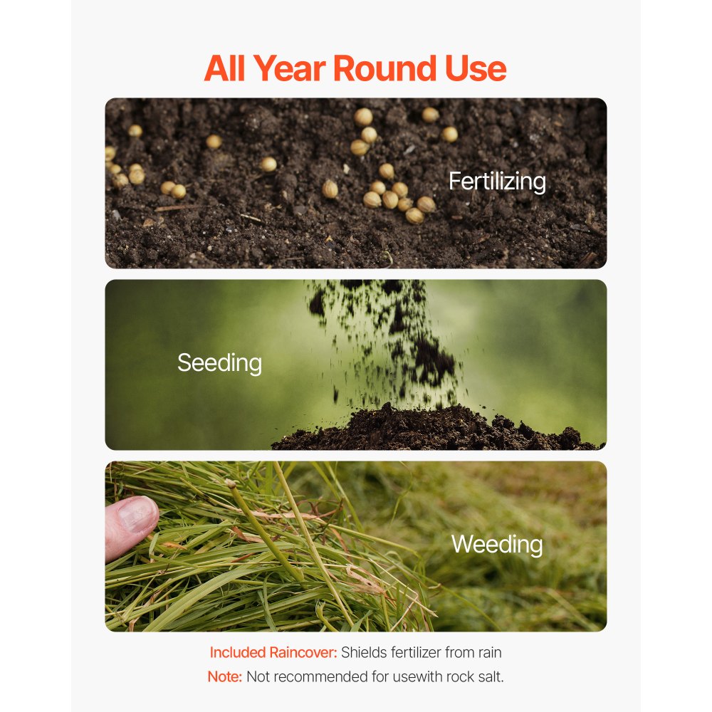 Celoroční všestrannost: Náš rozmetač semen je vhodný pro jarní setí, letní hnojení a nahrazuje čtyři nástroje jedním. Vhodný pro domácí trávníky a malé farmy.