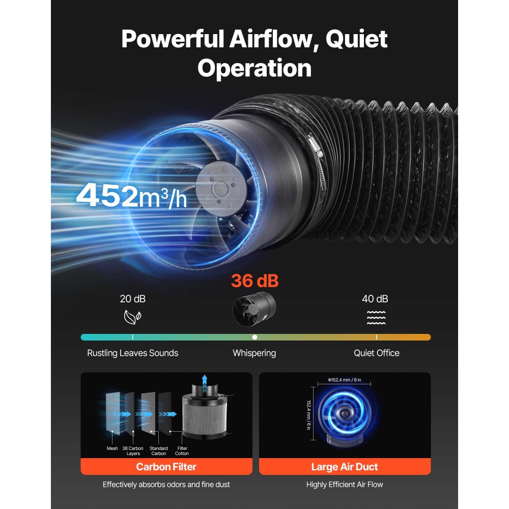 Efektivní ventilační systém: Díky velkému potrubnímu ventilátoru s průtokem vzduchu 452 m³/h a tichým provozem. Náš pěstební stan pro pokojové rostliny, v kombinaci s uhlíkovým filtrem a 2metrovou flexibilní odsávací trubkou, zajišťuje správné větrání, filtruje prach a eliminuje pachy, čímž udržuje optimální prostředí stanu pro zdraví rostlin.