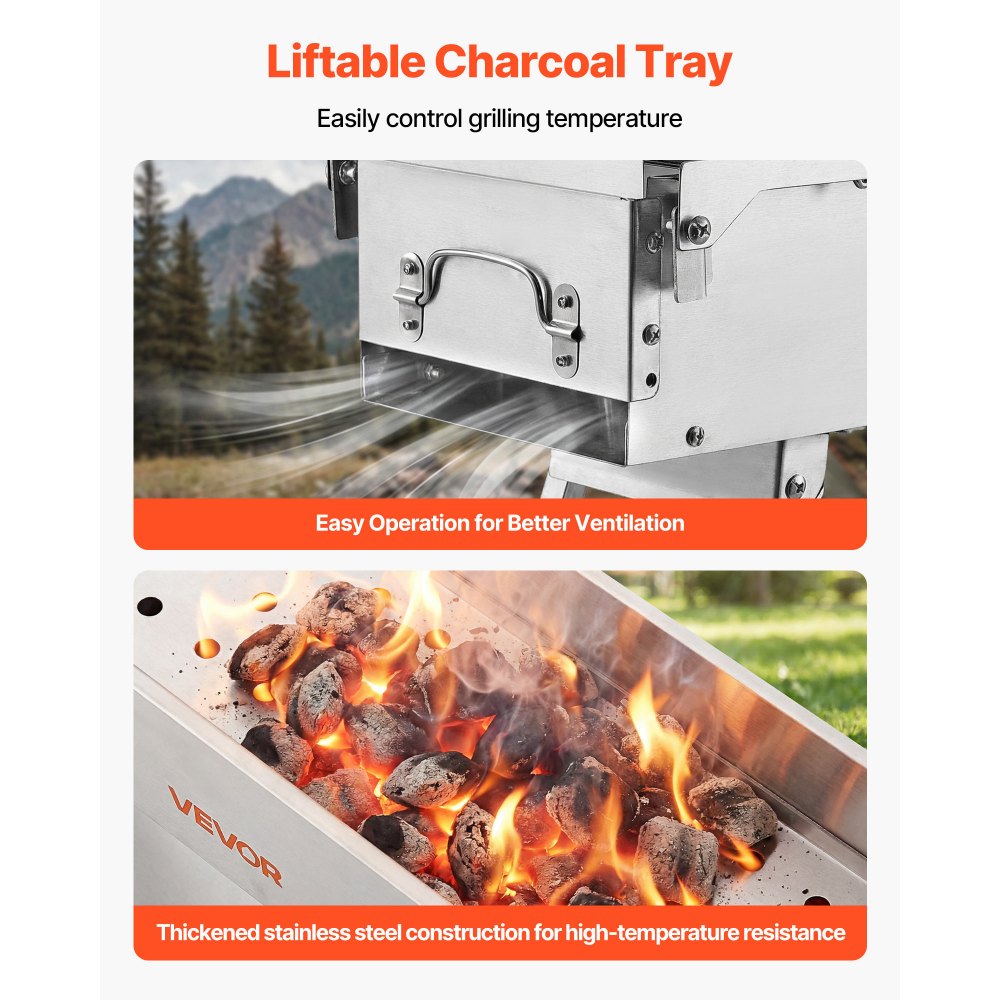 Snadné ovládání teploty: Zvedací miska na dřevěné uhlí umožňuje snadné zvednutí nebo snížení misky a nastavení teploty grilování. Díky nastavitelným větracím dvířkům na obou stranách skládací gril BBQ podporuje rovnoměrnou cirkulaci vzduchu a pomáhá dřevěnému uhlí plnějšímu hoření.
