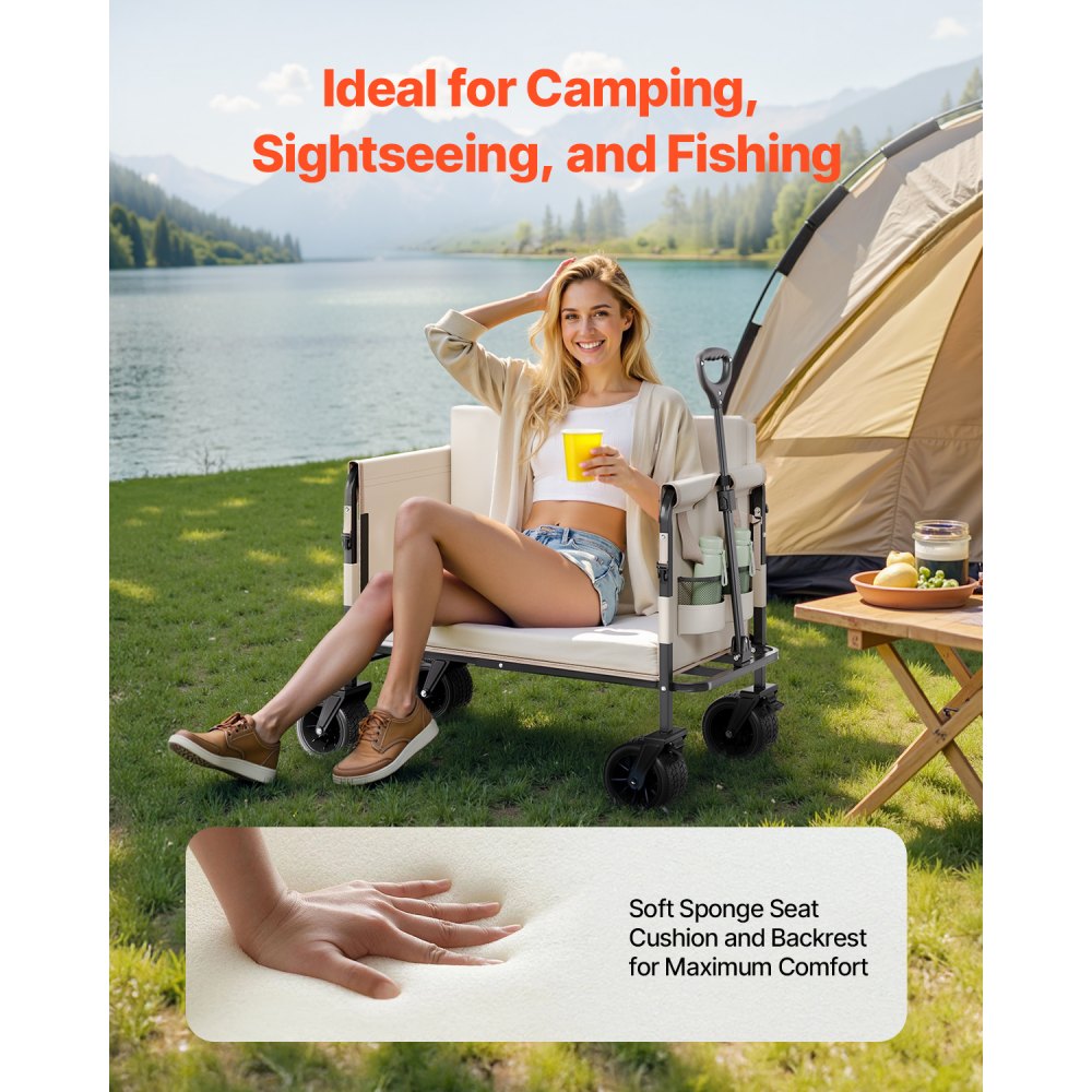 Multifunkční design: Tento skládací plážový vozík je ideální pro přepravu těžkých předmětů a lze jej okamžitě přeměnit na pohodlnou pohovku! Díky bočnímu otevírání a vysoce elastickému pěnovému polštáři se plážový vozík rychle rozloží na pohovku o šířce 75 cm. Ať už kempujete, prodáváte nebo pořádáte rodinné setkání, užijte si dovolenou bez nutnosti nosit další sedadlo, což vám ušetří námahu a místo.