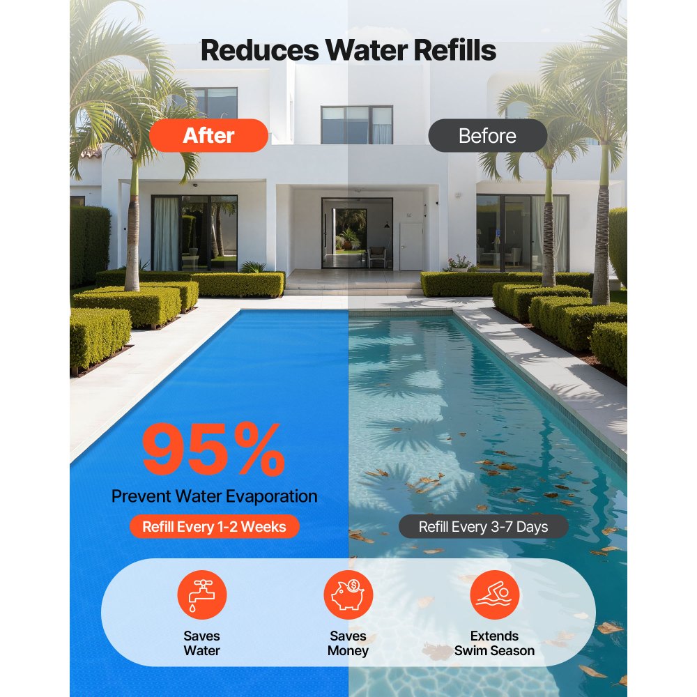 Jednoduchá údržba bazénu: S tepelně udržovací solární plachtou VEVOR udrží váš bazén čistý tím, že blokuje nečistoty, listí a malá zvířata. Je snadno ovladatelná a když se nepoužívá, lze ji pohodlně srolovat a uskladnit, čímž ušetříte místo a udržíte hladinu bazénu čistou.