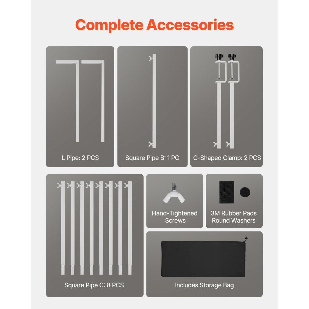 Úložný vak pro snadnou přepravu: Rám stolní tyče obsahuje čtvercové trubky (2 trubky ve tvaru L, 1 čtvercovou trubku, 8 trubek ve tvaru C, 2 trubky ve tvaru C), gumové podložky 3M, kulaté podložky, imbusový klíč, ručně utahované šrouby a úložný vak pro pohodlné skladování a přepravu. Chraňte stojan před poškrábáním a udržujte jej jako nový pro budoucí použití.