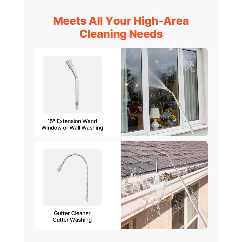 Bezproblémové čištění ve vysokém tlaku: Tato prodlužovací tyč tlakového čističe má třídílnou konstrukci, která se dá vysunout až do délky 2,74 m, což vám umožní bezpečně čistit vysoké plochy bez použití žebříku, ideální pro střechy, okapy a vyvýšené venkovní povrchy.