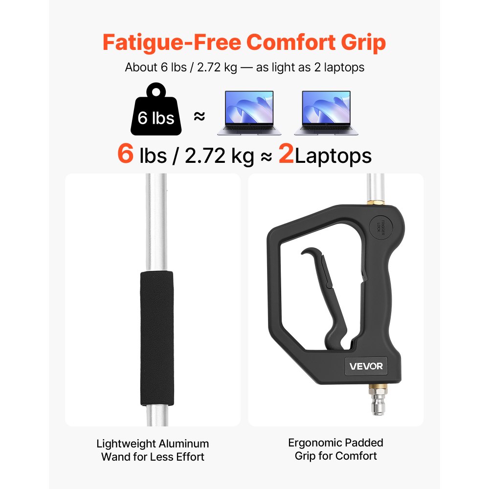 Pohodlné uchopení, snížená únava: Tato prodlužovací tyč tlakového čističe je vyrobena z lehké hliníkové tyče a umožňuje snadnější manipulaci při delším používání. Ergonomicky polstrovaná rukojeť zvyšuje pohodlí a ovladatelnost při delším čištění.