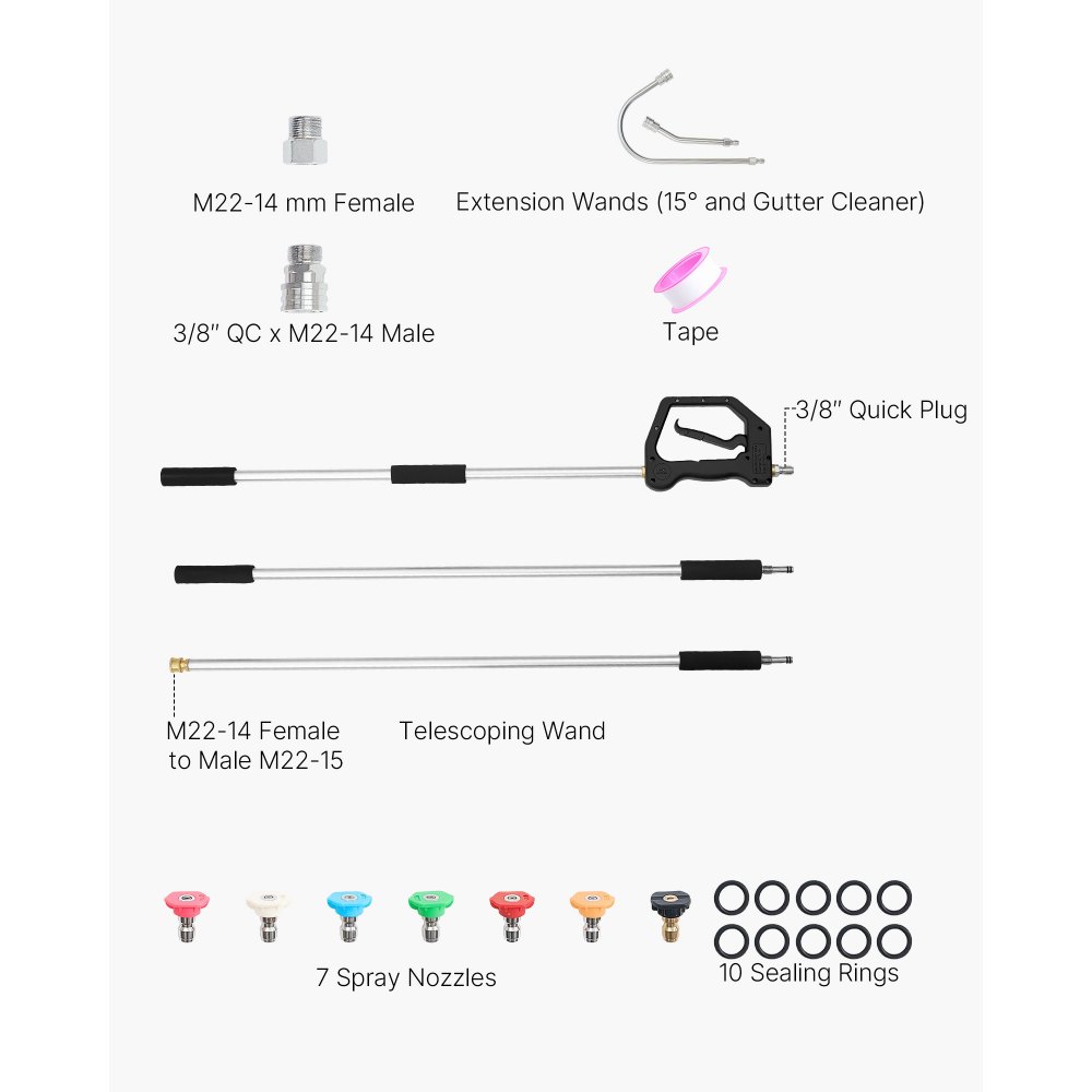 Všestranné čisticí možnosti: Toto prodloužení tlakové myčky obsahuje 7 trysek a 2 prodlužovací koncovky (15° a čistič okapů), které umožňují flexibilní nastavení úhlu pro různé potřeby čištění nad hlavou a těžko dostupných míst.