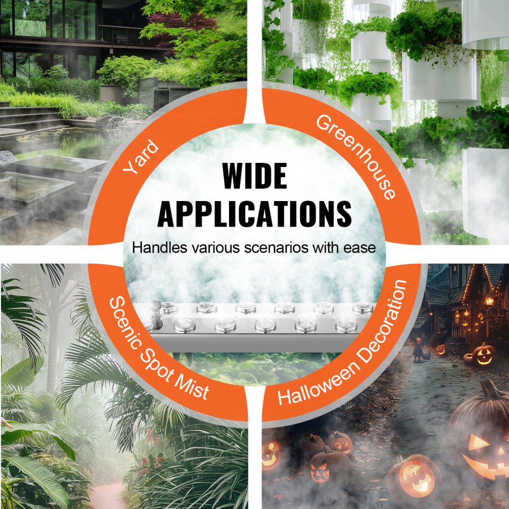 Široké použití: Náš rozprašovač do jezírka je ideální pro různé účely. Dokáže vytvořit speciální atmosféru a efekty pro pódia, halloweenské akce a další. Je také vhodný pro úpravu jezírek a zahrad, zvlhčování zeleniny ve sklenících a konzervaci ovoce a zeleniny.