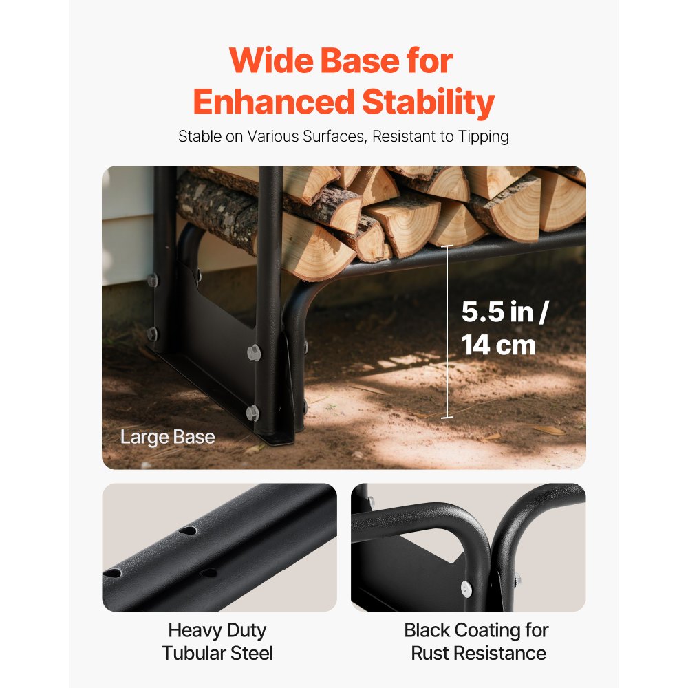 Široká základna, silná stabilita: Nenechte povětrnostní podmínky zničit vaše sklady palivového dřeva! Naše zesílená a rozšířená základna je speciálně navržena tak, aby pevně stála na různých površích a zabránila převrácení, a to i v případě silného větru a hustého sněhu. Na rozdíl od základny z jednoduchých ocelových trubek poskytuje naše široká základna bezpečnější ochranu vašeho skladovaného palivového dřeva.