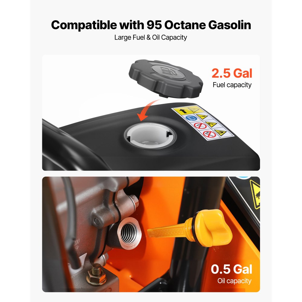 Velkokapacitní palivová nádrž: Tento benzínový zhutňovač má objem oleje 0,5 l a palivovou nádrž 2,5 l, používá benzín s oktanovým číslem 95. Stačí natankovat a můžete začít pracovat. Pro ochranu motoru se doporučuje nepřetržitý provoz po dobu až 40 minut.