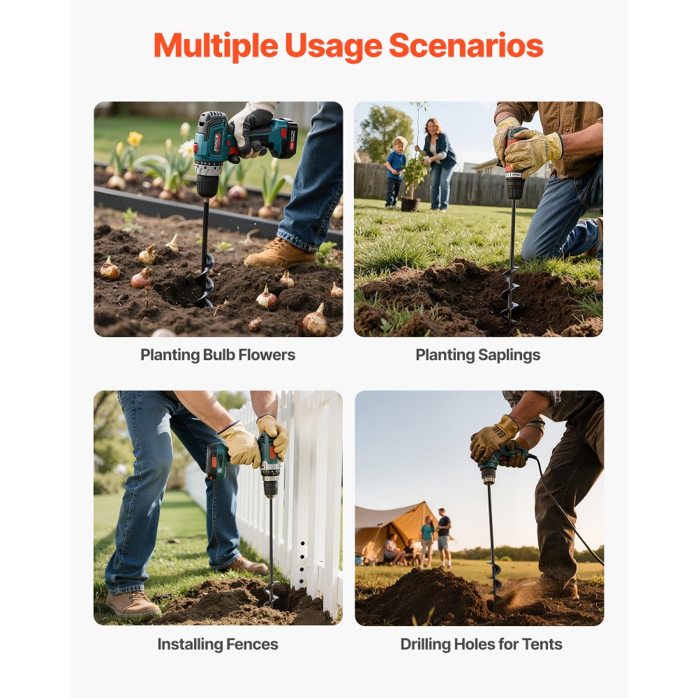Víceúčelový zahradnický nástroj: Vrták s vrtákem na sázení je nejen vhodný pro cibuloviny, květiny a zeleninu, ale také skvělý pro vrtání otvorů pro plotové sloupky, stany nebo venkovní dekorace. Nezbytný pomocník pro zahradničení, krajinářství i kutilské projekty.
