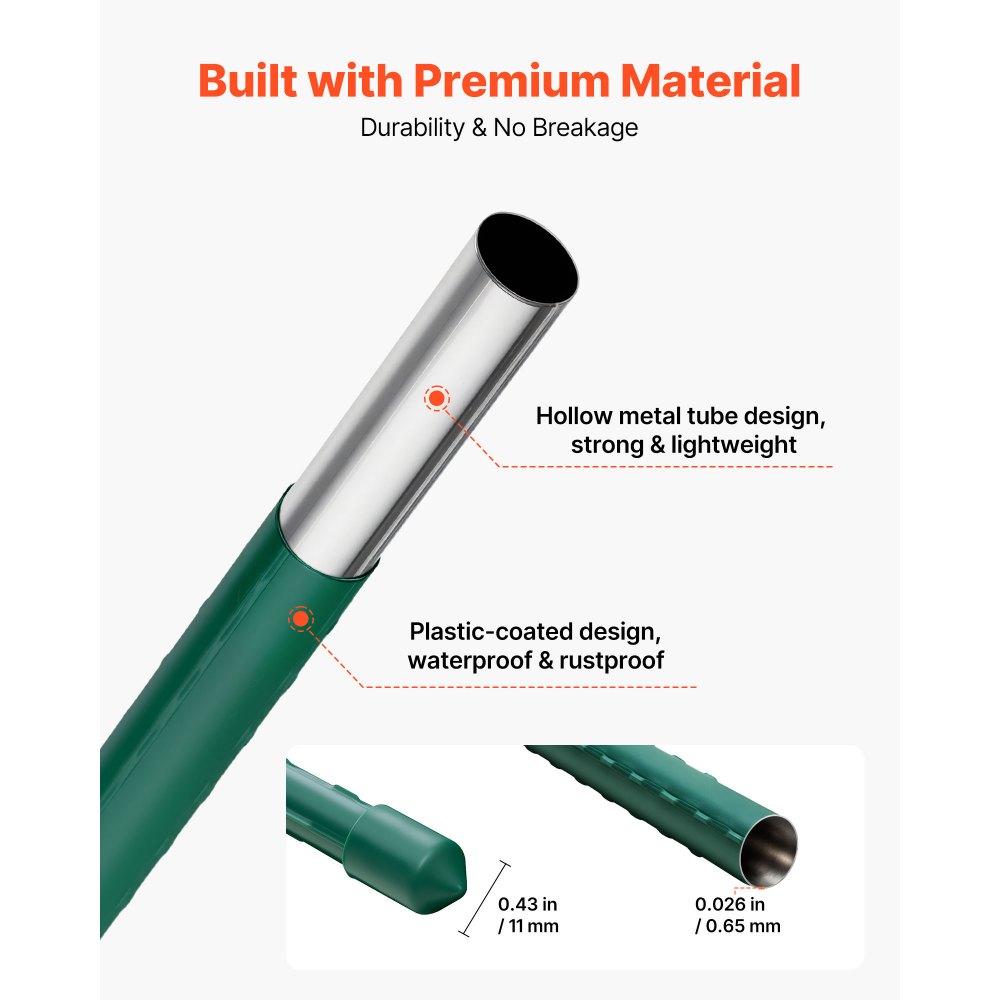 Prémiová ocel s PE povlakem: Tyto rajčatové tyče vyrobené z vysoce pevných kovových trubek s PE povlakem poskytují odolnost a pevnost v tlaku. Vrstva PE odolná vůči slunečnímu záření a povětrnostním vlivům odolává blednutí, praskání nebo deformaci, což zajišťuje dlouhou životnost při venkovním použití.