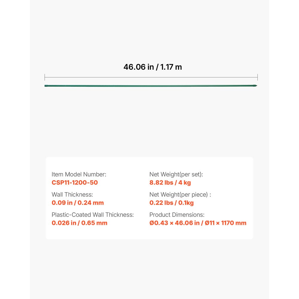 Zahradní kolíky VEVOR, balení 50 kusů, 1170 mm, plastem potažené kovové kolíky na rajčata, zahradní tyče pro podepření rostlin, se špičatým koncem a protiskluzovými výstupky pro pěstování popínavých rostlin, venkovní zelenina
