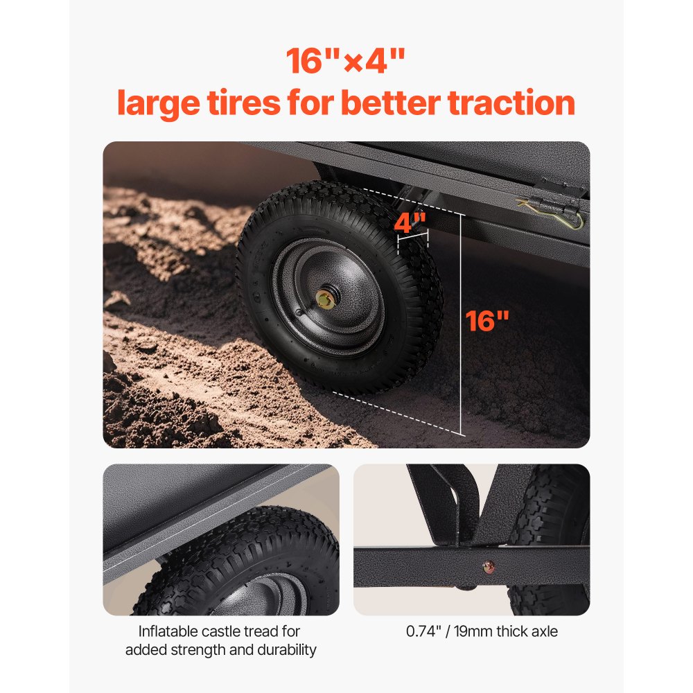 Přizpůsobivý náročnému terénu: Tento užitkový přívěs za sekačku na trávu s velkými pneumatikami o rozměrech 16" × 4" nabízí vynikající trakci a pevnost. Zajišťuje plynulý pohyb po nerovném povrchu, jako je tráva, bláto, písek a štěrk, a zesílená náprava s práškovým nástřikem pro větší odolnost.