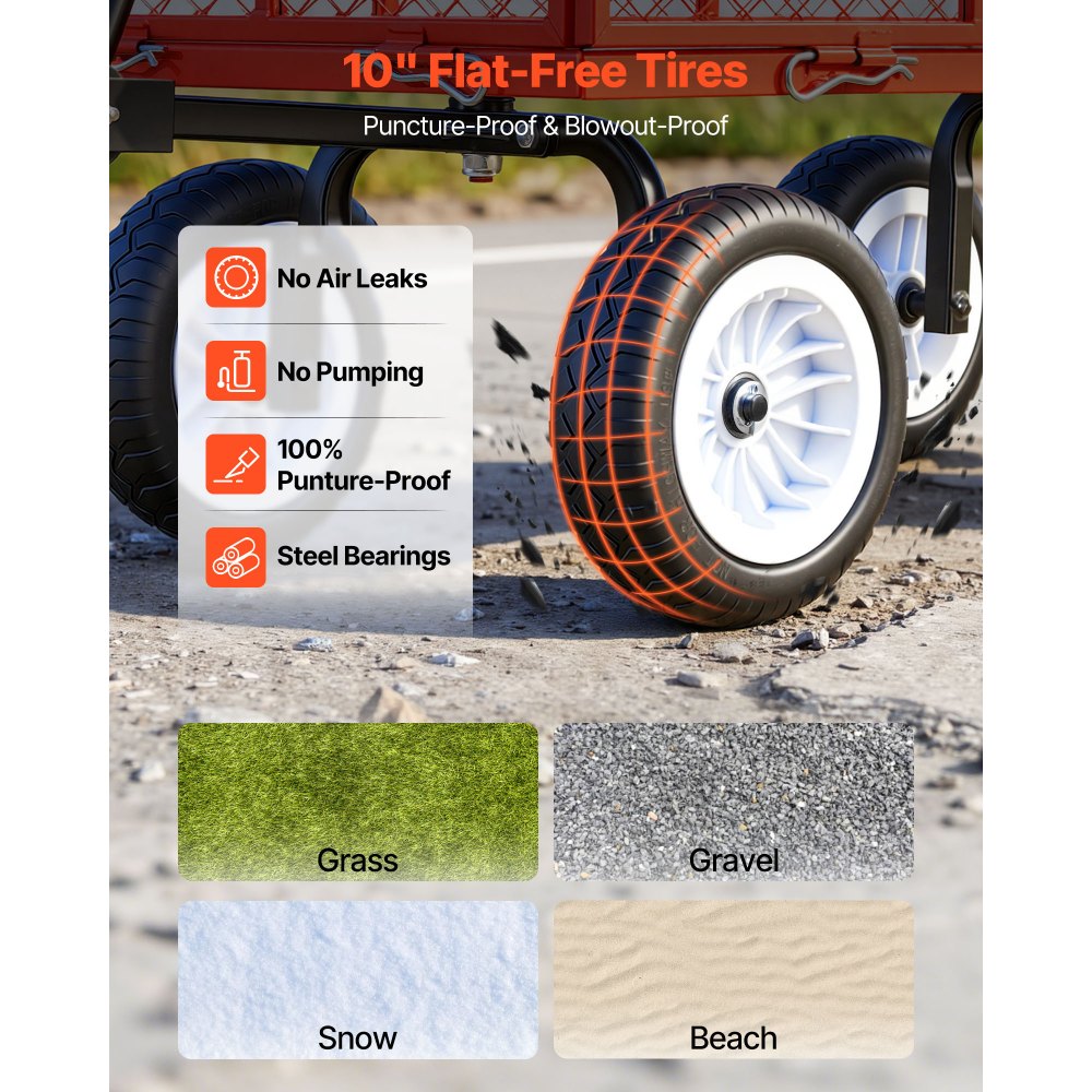 Zahradní vozík VEVOR, 408,2 kg, Odolný ocelový zahradní vozík s 10palcovými pneumatikami, Venkovní zahradní stolička s nastavitelnou rukojetí, Odnímatelné boční panely, Připevnění k čtyřkolce nebo traktoru, Červená