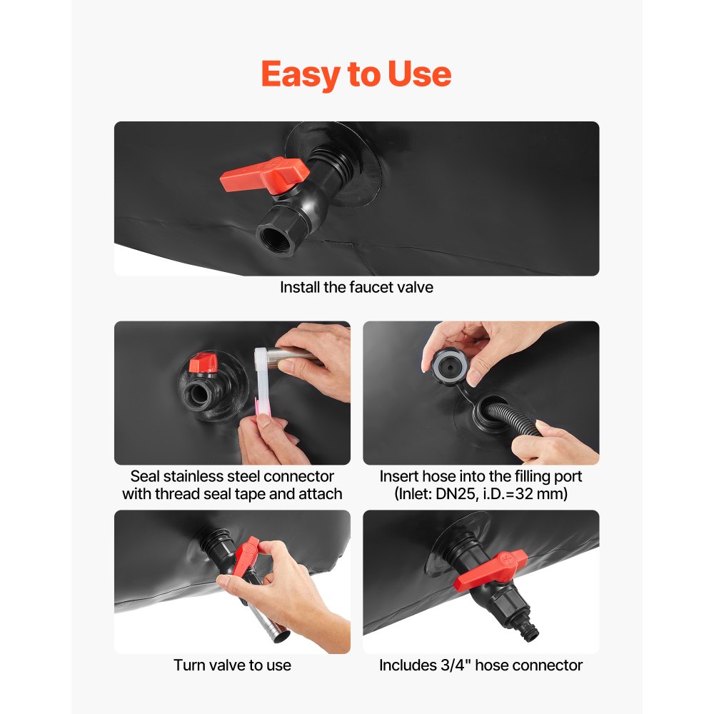 Snadné použití: Skládací vak na vodu je dodáván s předinstalovaným vstupním (DN25, vnější závit 32 mm) a výstupním (DN20, vnější závit 25 mm) armaturami. Stačí připojit kohoutek k výstupu a připojit zahradní hadici k naplnění. Připraveno k použití během několika minut.