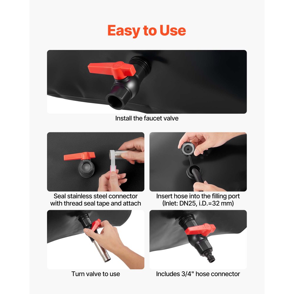 Snadné použití: Skládací vak na vodu je dodáván s předinstalovaným vstupním (DN25, vnější závit 32 mm) a výstupním (DN20, vnější závit 25 mm) armaturami. Stačí připojit kohoutek k výstupu a připojit zahradní hadici k naplnění. Připraveno k použití během několika minut.