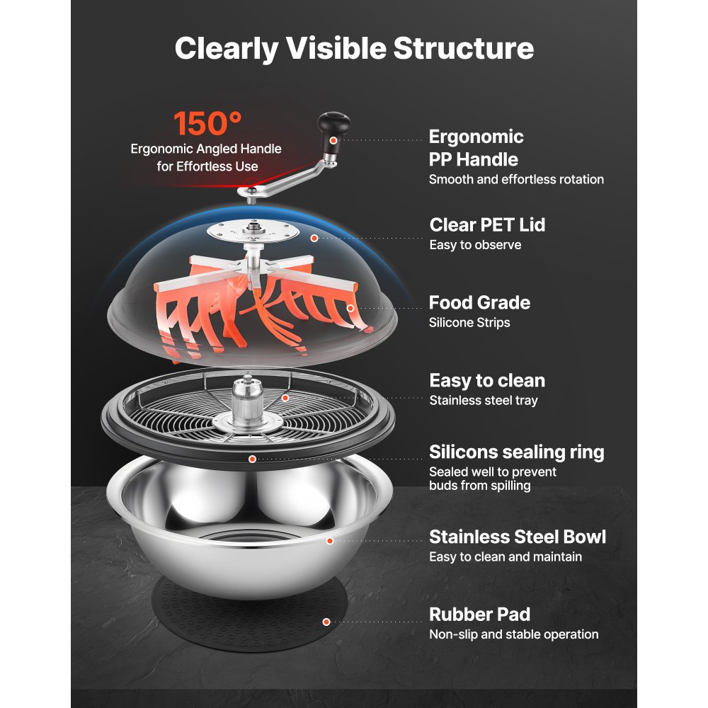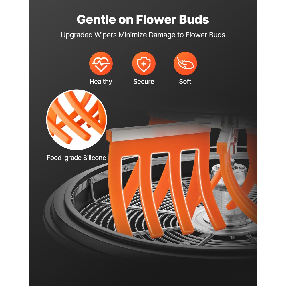 Efektivní zastřihování listů: Tento ruční zastřihovač pupenů o šířce 48 cm je vybaven výkonným motorem s proměnnou rychlostí a několika možnostmi nožů pro rychlé a efektivní zastřihování. Zastřihuje listy různých rostlin a minimalizuje poškození pupenů. Průhledné akrylové víko umožňuje viditelnost v reálném čase pro přesné výsledky zastřihování.