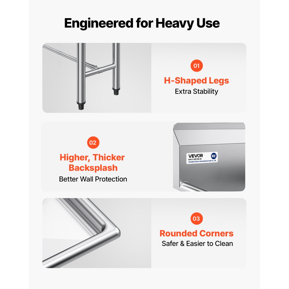 Vysoká ochrana proti postříkání: Tento komerční třídílný dřez je určen pro komerční prostředí a má obklad o výšce 18 cm. Pomáhá blokovat postříkání, udržovat čisté stěny a zkracovat dobu úklidu v rušných kuchyních.