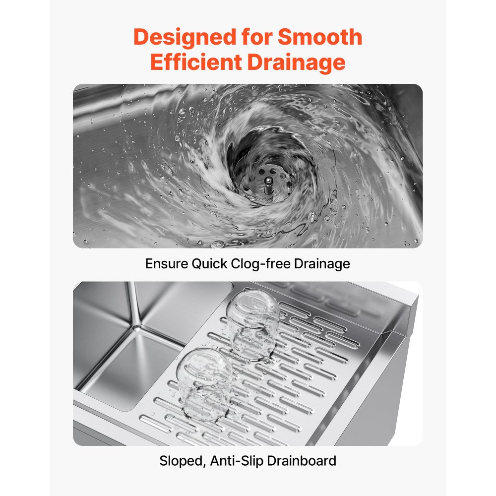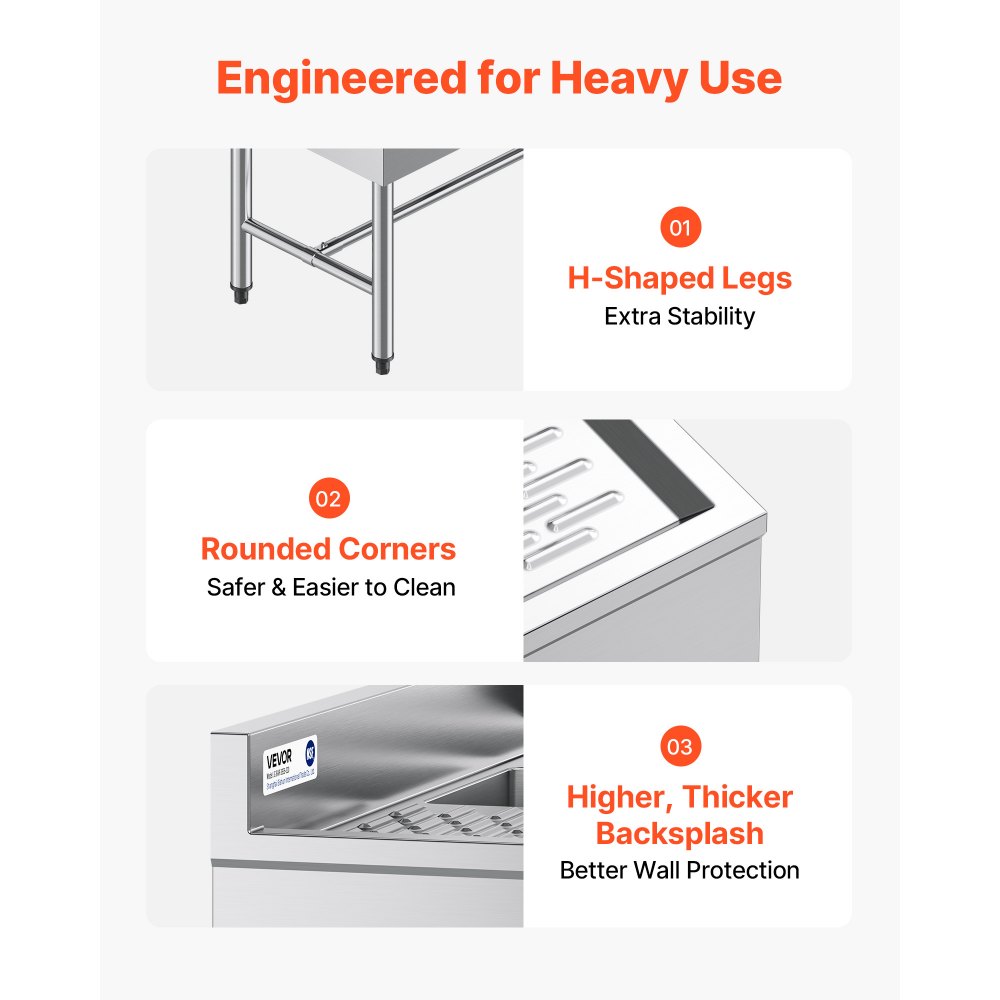 Vysoká ochrana proti postříkání: Tento komerční třídílný dřez je určen pro komerční prostředí a má 7,6 cm vysoký obklad. Pomáhá blokovat postříkání, udržovat čisté stěny a zkracovat dobu úklidu v rušných kuchyních.