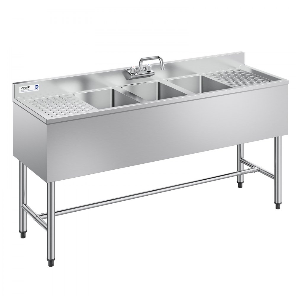 Dřez VEVOR se 3 přihrádkami, nerezová ocel 304 o průměru 18, velikost mísy 254x356x254 mm, třídílný komerční dřez pod bar s dvojitým odkapávacím otvorem a obkladem pro kuchyň, restauraci, food truck a domácí použití | Zařízení pro přípravu potravin | Originalnitextil.cz