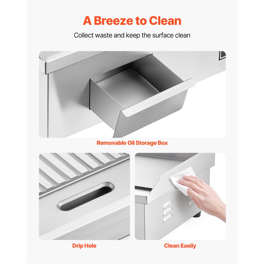 Snadné čištění: Zvětšený odkapávací otvor a odnímatelná miska na olej shromažďují odpad pro rychlé čištění. Náš komerční poloplochý gril je dodáván s kartáči a špachtlemi pro větší pohodlí.